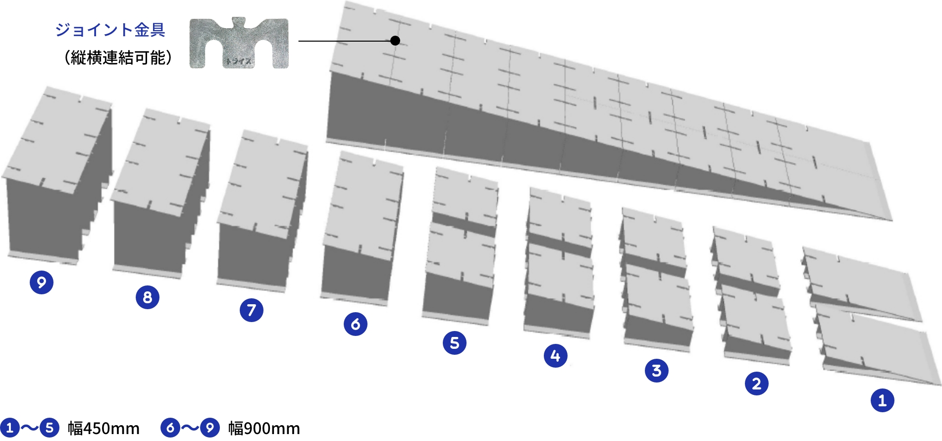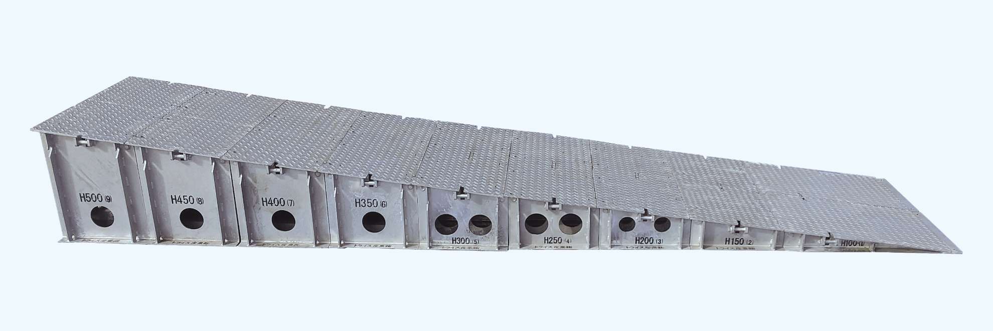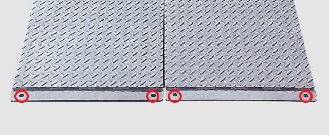 安全荷重を参考の上、通行されるものの動荷重・衝撃荷重等を算出し、確認してご使用ください。 - 本製品を複数並べてご使用の際は、専用の連結金具をご使用ください。